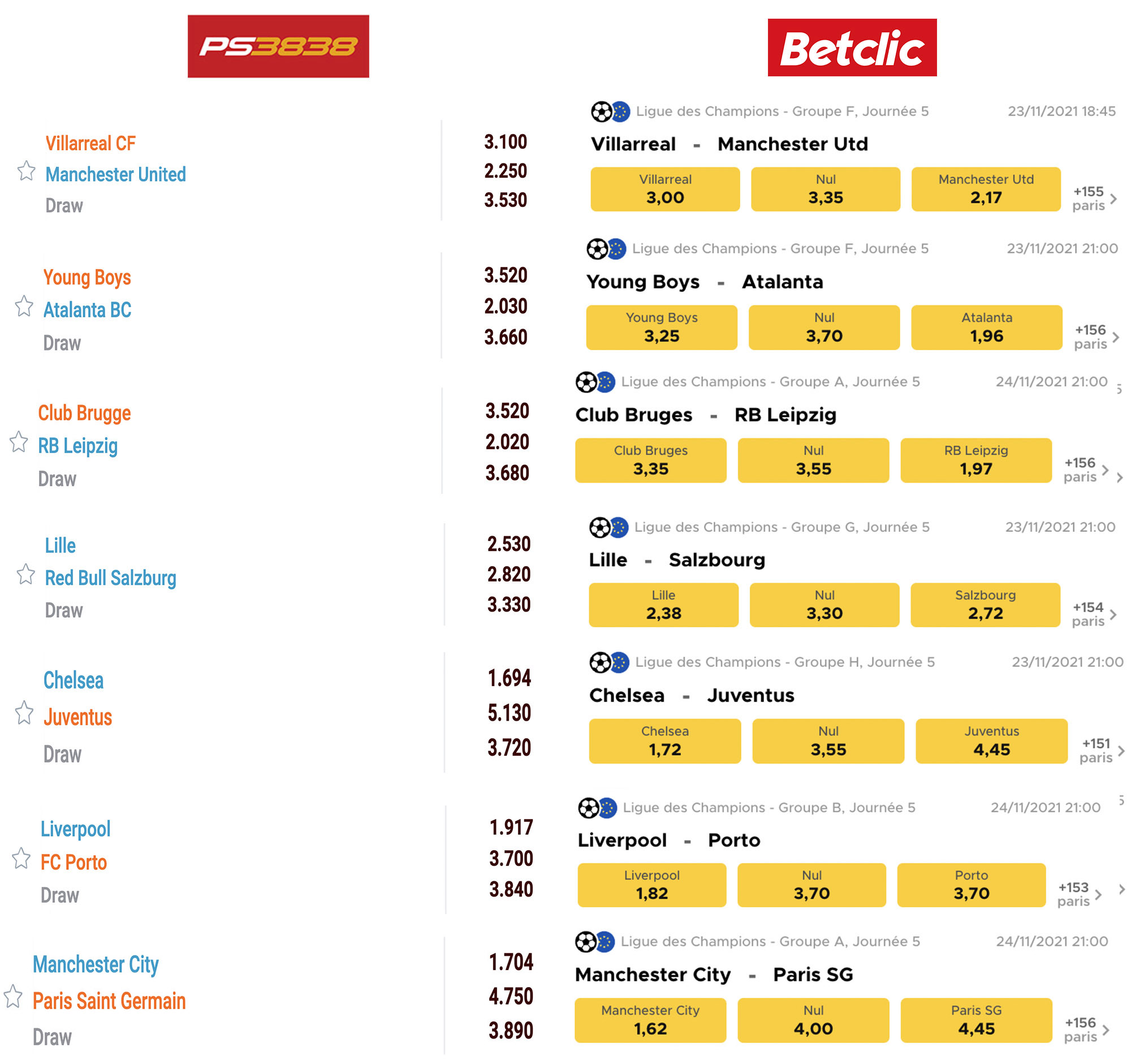 Comparaison des cotes sur les poules de C1 2021.