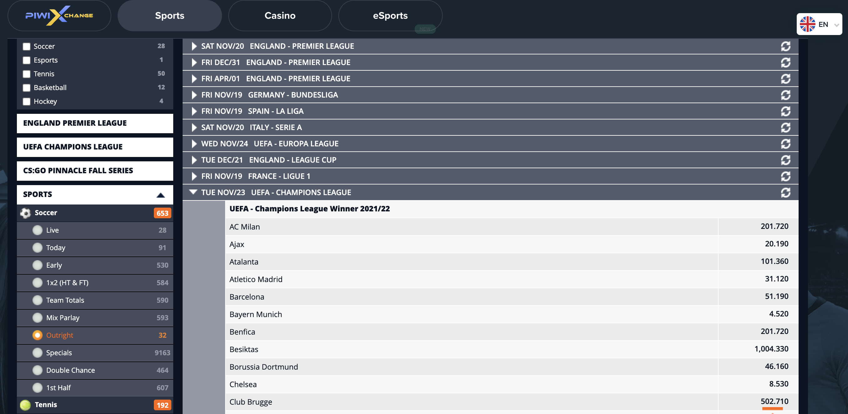 PIWI247 permet en un clic de basculer sur le marché de Pinnacle avec la même interface. Vous avez donc accès au marché strictement identique à celui de Pinnacle Sports. Cela comprend le marché live, pré-match et long terme avec les mêmes cotes et les mêmes avantages du marché Pinnacle.